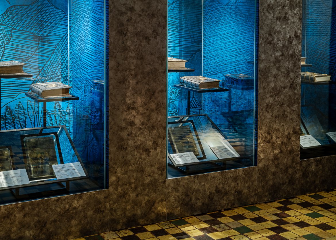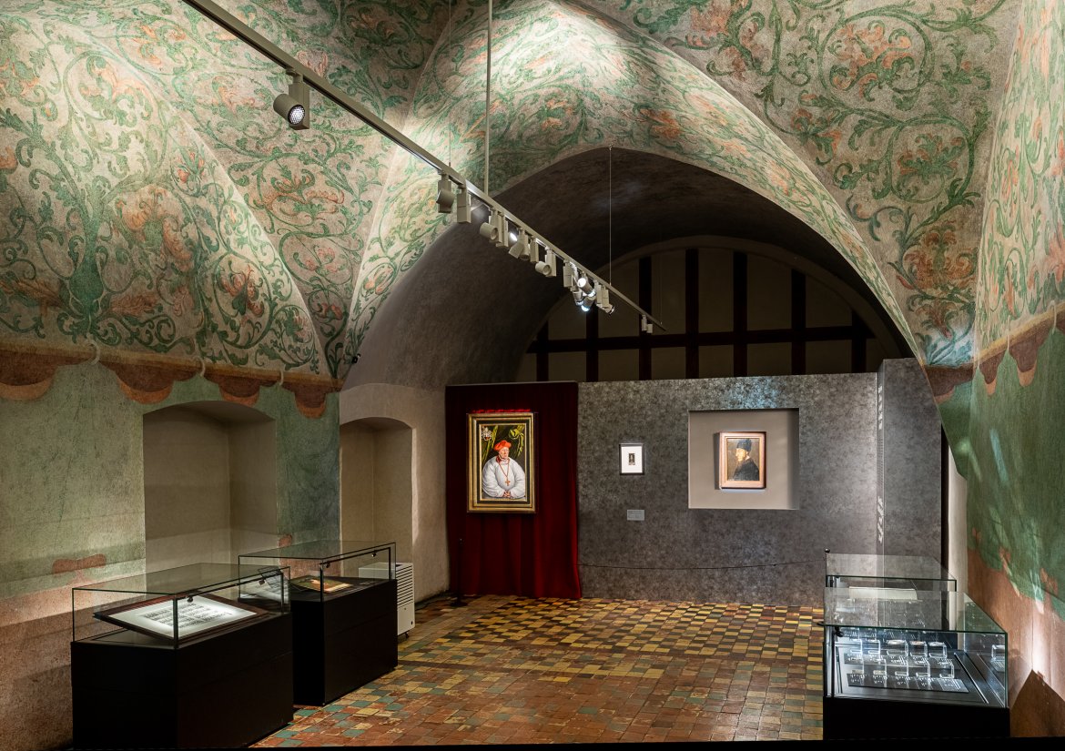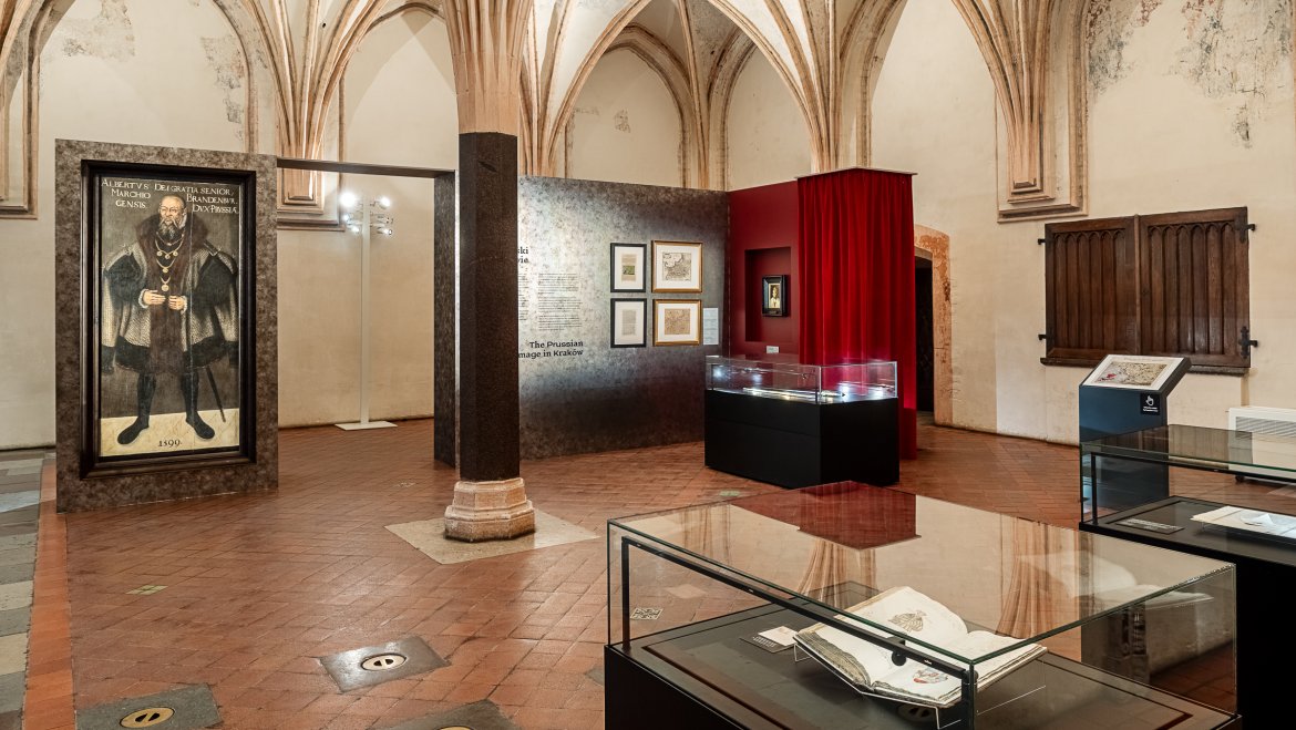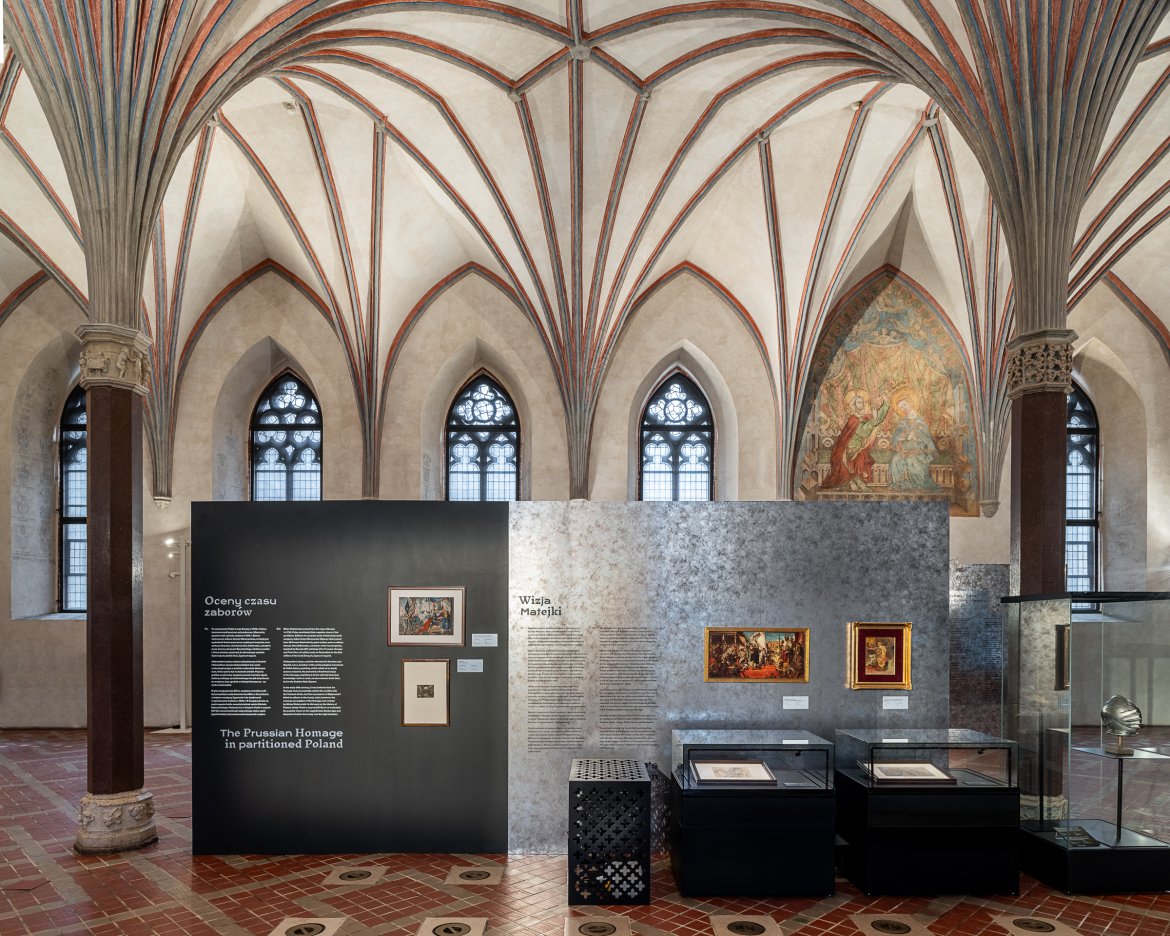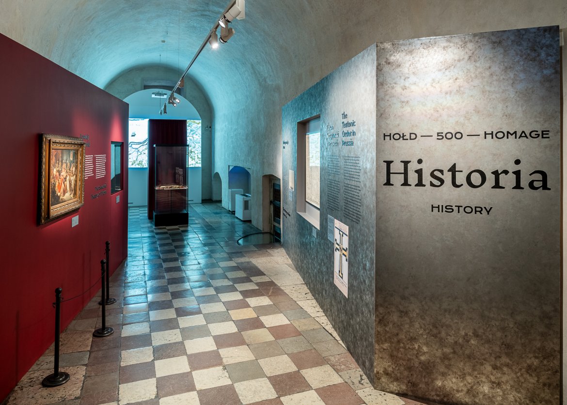 "Hołd 500. Historia – Kultura – Pamięć" to wielowątkowa wystawa we wnętrzach krzyżackiego zamku w Malborku. Aranżacja wystawy wpisuje się w historyczne wnętrza jednocześnie kontrastując z nimi wykorzystanymi materiałami. Ściany ekspozycyjne wykończono w stalowych szarościach podkreślają historyczny charakter prezentowanych obiektów, a akcent kolorystyczny stanowią zasłony z aksamitu (czerwonego i niebieskiego), tworzące tło dla wybranych dzieł sztuki. Zestawienie miękkiej tkaniny i stalowe wykończenie odpowiada: Zakonowi Krzyżackiemu oraz Królestwu Polskiemu. W ramach ścieżki zwiedzania powstała seria stanowisk edukacyjnych angażujących odbiorców.